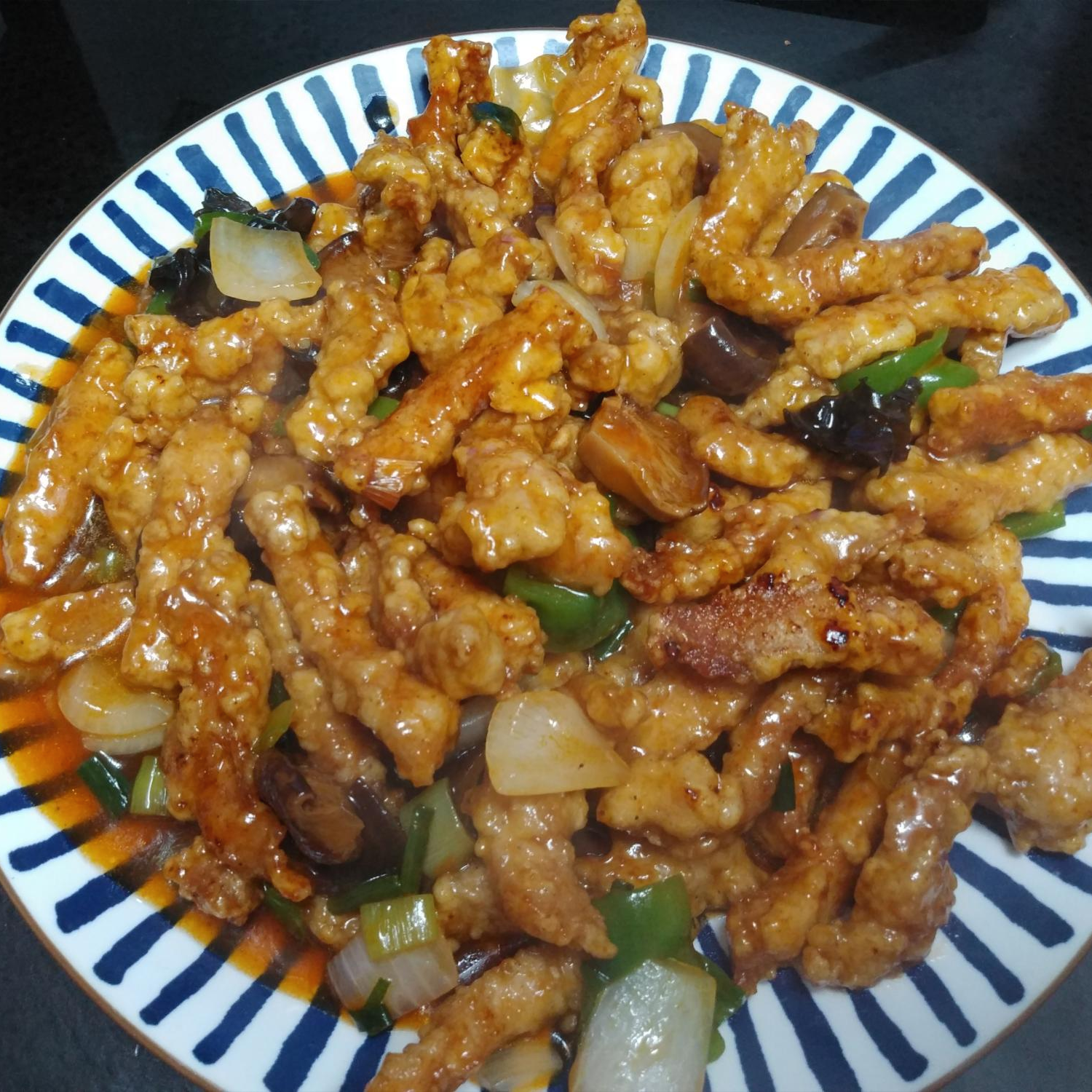 라조육(辣椒肉)은 중국식 매운 고기 요리로, 바삭하게 튀긴 돼지고기에 칠리 소스를 얹어 만든 음식이다.